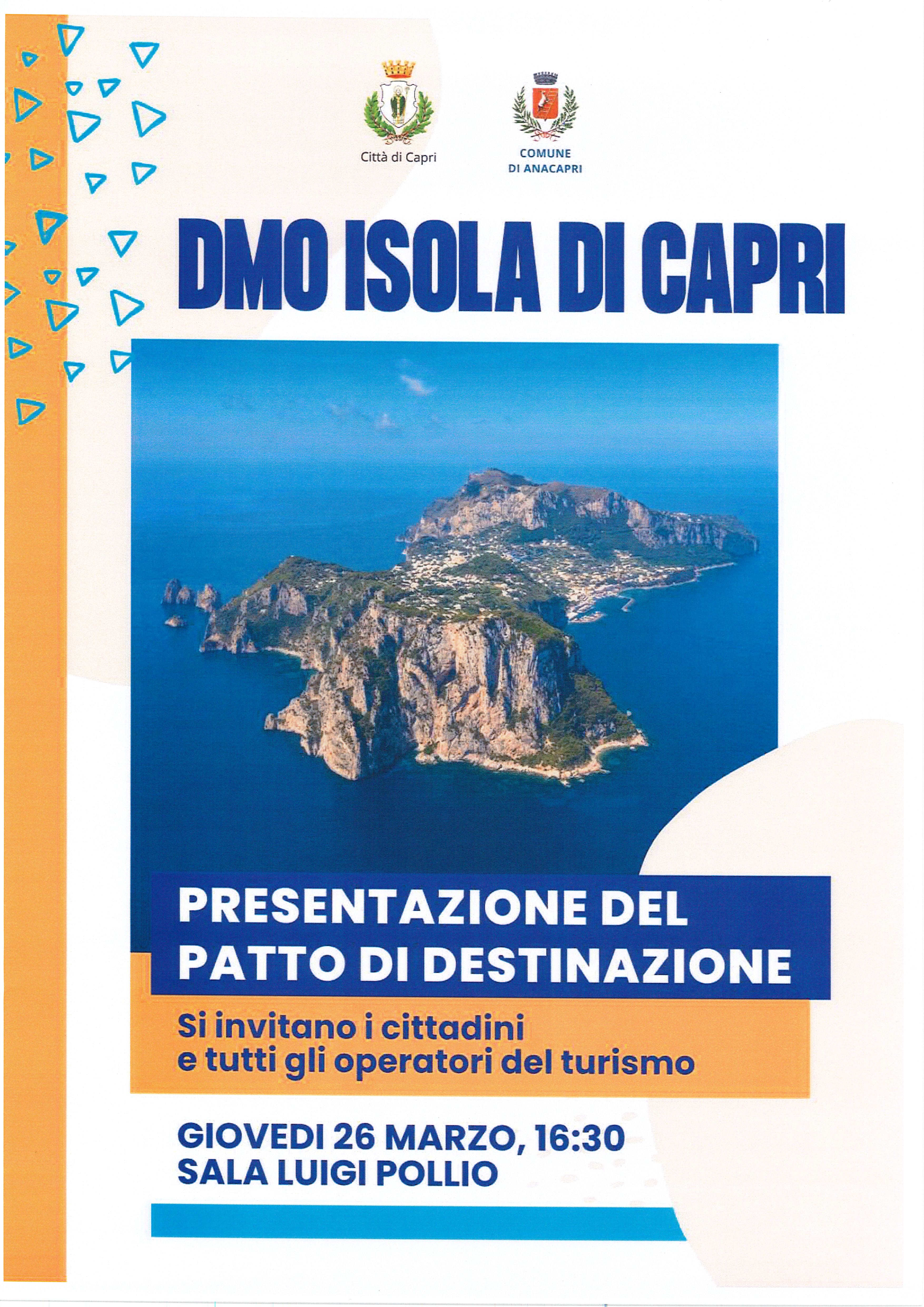 Giovedì 26 Marzo alle ore 16,30 presso la Sala "L. Pollio" di Capri ci sarà la presentazione alla cittadinanza del Patto di Destinazione della “DMO Isola di Capri”, strumento strategico per la costruzione di una visione condivisa e sostenibile del turismo a Capri.